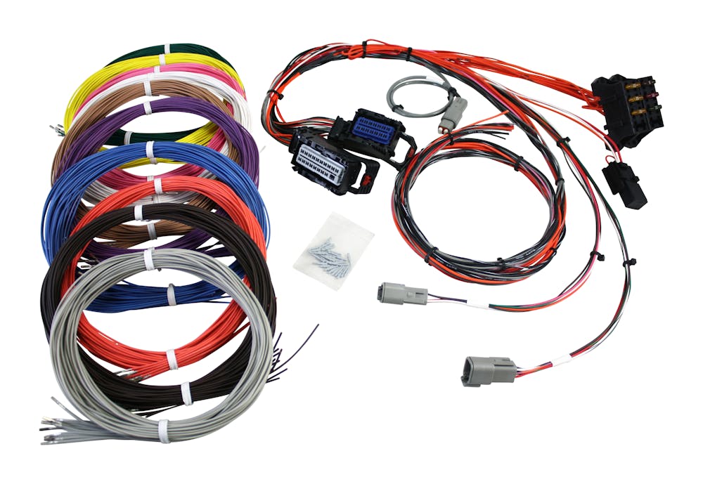 Infinity Series 7(PN: 30-7101, 30-7100, 30-7111) Harness. Pre-wired power, grounds, power relay, fuse box, dual widebands & AEMnet. 100 x 96 in terminated wires for population. 12 small Pins.