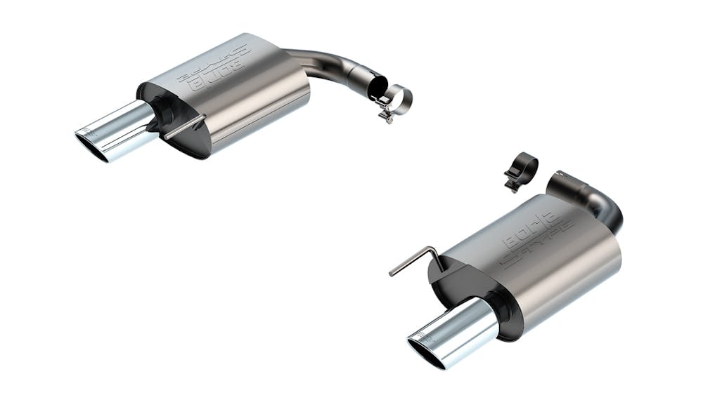 This 2.5″ diameter Borla(r) Axle-Back system is designed for use on EcoBoost cars WITHOUT the Active Exhaust feature. It features the classic S-Type sound with no drone inside the vehicle and single 4″ round bright chrome on T-304 stainless steel tips on each muffler assembly. Systems with black chrome on T-304 stainless steel tips, and carbon fiber tips are also available. Borla(r) Cat-Back(tm) and Axle-Back exhaust systems feature patented straight-through and multi-core technology designed to unleash hidden horsepower. Increased exhaust velocity adds power, driving excitement, fuel economy, and the distinctive Borla(r) Sound of Power respected by motoring enthusiasts everywhere. Each system is built from premium T-304 stainless steel, superior to T-400 series knockoffs (such as 409), to give you the absolute best in performance and durability. Ultra-smooth mandrel bends ensure maximum flow & power, and precision computer numerical control (CNC) manufacturing ensures an accurate fit. Best of all, Borla(r) stands behind every system with a Million-Mile Warranty. Just what you’d expect from the world’s most experienced (and most winning) exhaust brand.