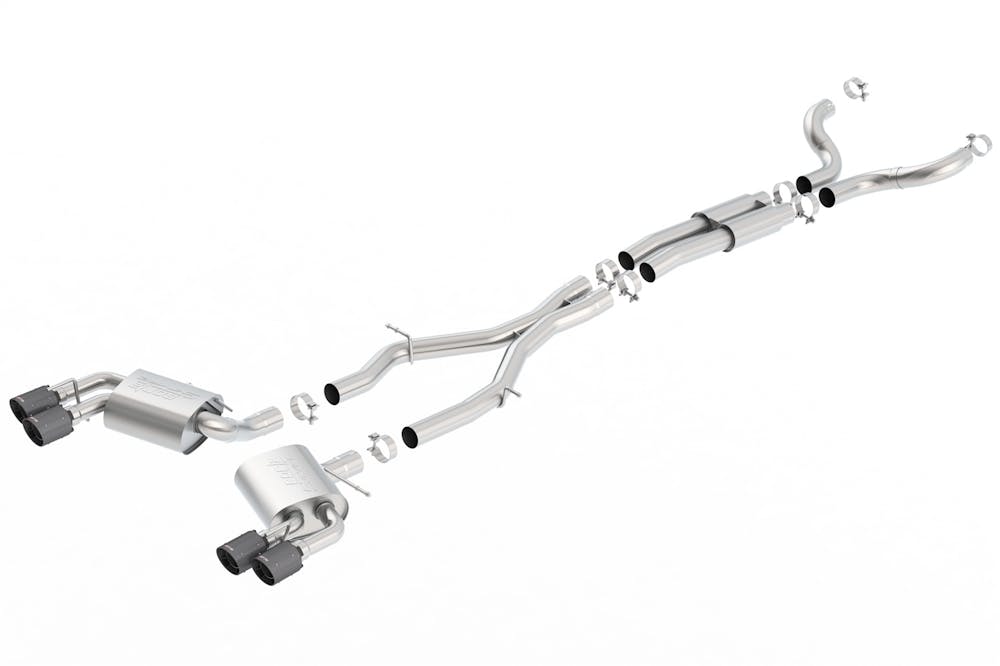 EXCEPT Convertible. System contains a merge X-pipe for increased performance and improved flow. This system has dual tips with carbon fiber shells and black anodized centers, and will fit vehicles equipped with Dual Mode Exhaust (NPP), but it does NOT include Dual Mode or AFM valves. On vehicles equipped with AFM a check engine light will be activated. It may be used with the dual tip lower bumper cover to convert a single, split rear exit to a dual split rear exit. 3″ diameter system is intended for vehicles with significant upgrades that require a larger diameter exhaust. It is recommended for use with Long Tube Headers. BORLA(r) Cat-Back(tm) and Axle-Back multi-core technology is designed to unleash hidden horsepower. Increased exhaust velocity adds power, driving excitement, fuel economy, and the distinctive BORLA(r) Sound of Power respected by motoring enthusiasts everywhere. Each system is built from premium T-304 stainless steel, superior to T-400 series knockoffs (such as 409), to give you the absolute best in performance and durability. Ultra-smooth mandrel bends ensure maximum flow& power, and precision computer-controlled CNC manufacturing ensures an accurate fit. Best of all, BORLA(r) stands behind every system with a Million-Mile Warranty. Just what you’d expect from the world’s most experienced (and most winning) exhaust brand.