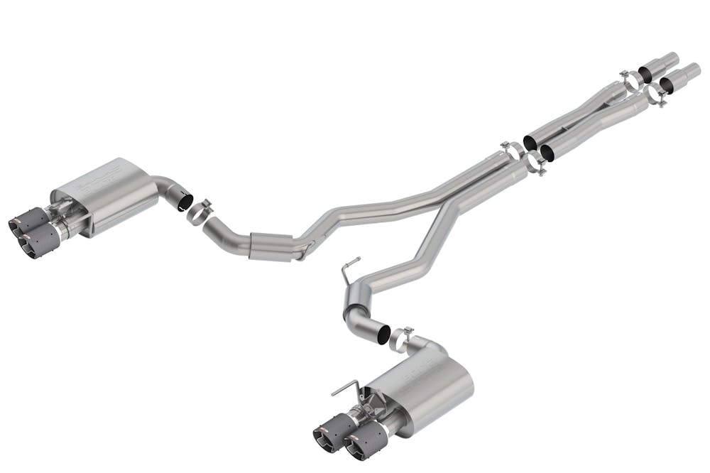 System will fit Bullitt models. NOT recommended for use on convertibles. 3″ diameter system. System contains a merge X-Pipe for increased performance and improved sound. System has Active Valve Exhaust valves. Equipped with Carbon Fiber Tips with bright centers. BORLA(r) Cat-Back(tm) and Axle-Back exhaust systems feature patented straight-through and multi-core technology designed to unleash hidden horsepower. Increased exhaust velocity adds power, driving excitement, fuel economy, and the distinctive BORLA(r) Sound of Power respected by motoring enthusiasts everywhere. Each system is built from premium T-304 stainless steel, superior to T-400 series knockoffs (such as 409), to give you the absolute best in performance and durability. Ultra-smooth mandrel bends ensure maximum flow& power, and precision computer-controlled CNC manufacturing ensures an accurate fit. Best of all, BORLA(r) stands behind every system with a Million-Mile Warranty. Just what you’d expect from the world’s most experienced (and most winning) exhaust brand.