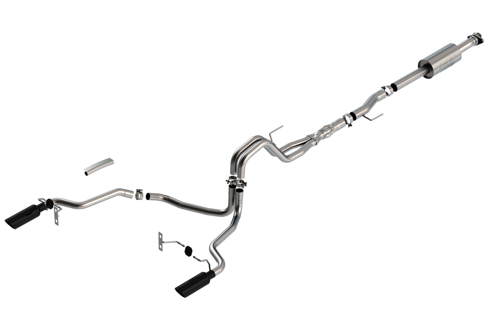 The Borla(r) Cat-Back(tm) system 140867BC was specifically designed to enhance the power and sound of the Ford F-150 equipped with the 5.0L V8 engine. It includes black chromed T-304 stainless steel tips and a split rear exit configuration. The entire system is made of T-304 stainless steel and utilizes computer numerical control (CNC) manufacturing techniques that ensure an accurate fit. This system features the ATAK(r) sound that gives you an aggressive sound with no drone. It is also available with bright chromed tips (part number 140867). There are additional systems available for the 5.0L F-150 that offer different options for sound level, tip finish and tip exits. Add adapter 60556 for Crew Cab Standard Bed (157.2) wheelbase vehicles. Add adapter 60564 for Extended Cab Long Bed (164.1) wheelbase vehicles. All this is backed by our unsurpassed Million Mile Warranty., System Features:, Cat-Back(tm) System, Split Rear Exit, Black Chrome On T-304 Stainless Steel Tips, ATAK(r) Sound Level, T-304 Stainless Steel Construction, Bolt-On Installation, Million Mile Warranty
