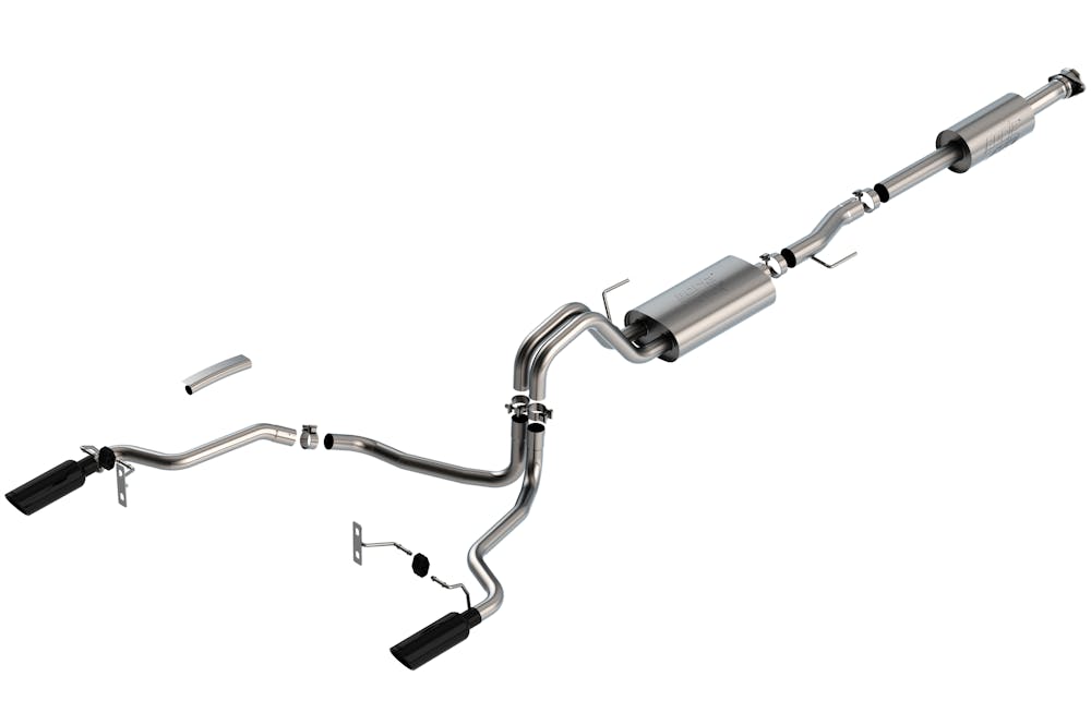 The Borla(r) Cat-Back(tm) system 140879BC was specifically designed to enhance the power and sound of the Ford F-150 equipped with 3.3L engine. It includes black chromed T-304 stainless steel tips and a split rear exit configuration. The entire system is made of T-304 stainless steel and utilizes computer numerical control (CNC) manufacturing techniques that ensure an accurate fit. This system features the ATAK(r) sound level that gives you our most aggressive sound level with no drone. It is also available with bright chromed tips (part number 140879). There are also systems available for the 3.3L F-150 that offer different options for sound level, tip finish and tip exits. Add adapter 60556 for Crew Cab Standard Bed (157.2) Wheelbase Vehicles Add adapter 60564 for Extended Cab Long Bed (164.1) wheelbase vehicles. All this is backed by our unsurpassed Million Mile Warranty., System Features:, Cat-Back(tm) System, Split Rear Exit, Black Chrome On T-304 Stainless Steel Tips, ATAK(r) Sound Level, T-304 Stainless Steel Construction, Bolt-On Installation, Million Mile Warranty