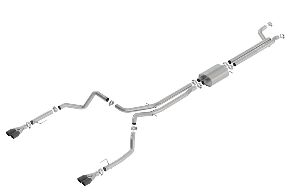 EXCEPT ZR2 & AT4X models. Factory Split Rear Exit vehicles ONLY. This system features a black chrome finish on T-304 stainless steel tips. Using BORLA(r) Stainless Steel Polish p# 21461 is NOT recommended with these black chrome tips. We suggest cleaning the tips with hot water and a microfiber cloth. This Cat-Back(tm) system by BORLA(r) is unique in the industry. It features a “True Dual” design which requires cutting the the factory Y-Pipe. The system has the famous BORLA(r) “S-Type” sound level. The muffler contains an internal H-Pipe for increased performance and improved sound. It is built with premium, high-quality austenitic T-304 stainless steel using computer numerical control (CNC) manufacturing techniques that ensures accurate fit and maximum performance. All this without the annoying drone often associated with performance exhaust systems. Best of all, BORLA(r) stands behind every system with a Million-Mile Warranty. Just what you’d expect from the world’s most experienced (and most winning) exhaust brand.