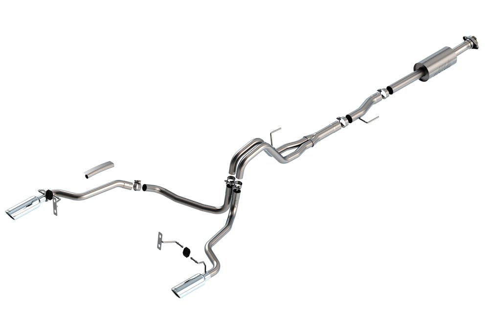 The BORLA(r) Cat-Back(tm) system 140863 was specifically designed to enhance the power and sound of the Ford F-150 equipped with 2.7L and 3.5L Engines. EXCEPT 3.5L PowerBoost and Tremor models. It includes bright chromed T-304 stainless steel tips and a split rear exit configuration. The entire system is made of T-304 stainless steel and utilizes computer numerical control (CNC) manufacturing techniques that ensure an accurate fit. This system features the “S-Type” sound that gives you an aggressive sound with no drone. It is also available with black chromed tips (part number 140863BC). There are additional systems available for the 2.7L and 3.5L F-150 that offer different options for sound level, tip finish and tip Exits. Add Adapter 60556 for Crew Cab with Standard Bed (157.2″) Wheelbase vehicles. Add Adapter 60564 for Extended Cab with Long Bed (164.1″) Wheelbase vehicles. All this is backed by our unsurpassed Million Mile Warranty., System Features:, Cat-Back(tm) System, Split Rear Exit, Bright Chrome On T-304 Stainless Steel Tips, S-Type Sound Level, T-304 Stainless Steel Construction, Bolt-On Installation, Million Mile Warranty
