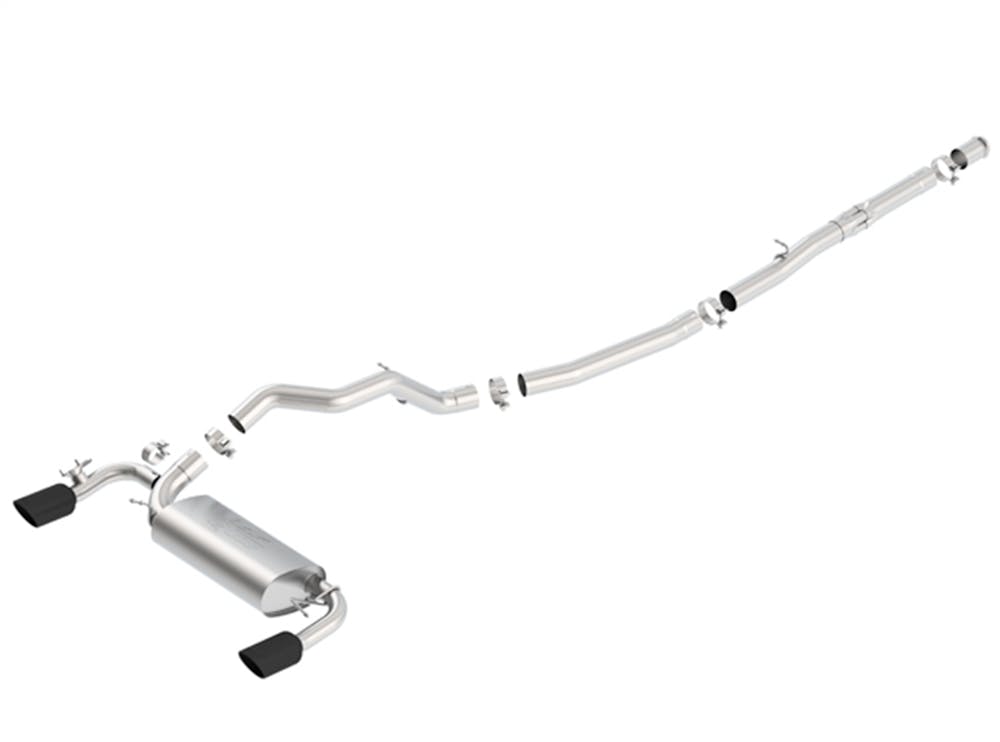 This system is equipped with a Sound Suppressing Valve simulator which ELIMINATES the valve. This avoids any warning lights on the dash while providing maximum flow at all times. System features Borla’S Polyphonic Harmonizer Technology which utilizes patented units that contain pipes of different diameters and lengths to create multiple exhaust notes that harmonize to deliver a clean, rich, full-bodied sound to the Borla mufflers. The mufflers then enhance this sound to the character and volume appropriate for our Touring, S-Type and ATAK systems. This system also features a black chrome finish on T-304 stainless steel tips. Using Borla Stainless Steel Polish p# 21461 is NOT recommended with these black chrome tips. We suggest cleaning the tips with hot water and a microfiber cloth. Borla Cat-Back and Axle-Back exhaust systems feature patented straight-through and multi-core technology designed to unleash hidden horsepower. Increased exhaust velocity adds power, driving excitement, fuel economy, and the distinctive Borla Sound of Power respected by motoring enthusiasts everywhere. Each system is built from premium T-304 stainless steel, superior to T-400 series knockoffs (such as 409), to give you the absolute best in performance and durability. Ultra-smooth mandrel bends ensure maximum flow & power, and precision computer-controlled CNC manufacturing ensures an accurate fit. Best of all, Borla stands behind every system with a Million-Mile Warranty. Just what you’d expect from the world’s most experienced (and most winning) exhaust brand.