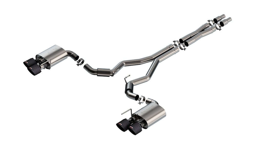 This BORLA Cat-Back system was designed specifically for the Mustang Dark Horse. 3″ diameter True Dual system for high flow. System contains a merge X-Pipe for increased performance and improved sound. System has Active Exhaust valves. This system features the classic S-Type sound and 5″ carbon fiber with black anodized center tips. Systems with bright chrome on T-304 stainless steel tips, and black chrome on T-304 stainless steel are also available. BORLA Cat-Back and Axle-Back exhaust systems feature patented straight-through and multi-core technology designed to unleash hidden horsepower. Increased exhaust velocity adds power, driving excitement, fuel economy, and the distinctive BORLA Sound of Power respected by motoring enthusiasts everywhere. Each system is built from premium T-304 stainless steel, superior to T-400 series knockoffs (such as 409), to give you the absolute best in performance and durability. Ultra-smooth mandrel bends ensure maximum flow & power, and precision computer numerical control (CNC) manufacturing ensures an accurate fit. Best of all, BORLA stands behind every system with a Million-Mile Warranty. Just what you’d expect from the world’s most experienced (and most winning) exhaust brand.