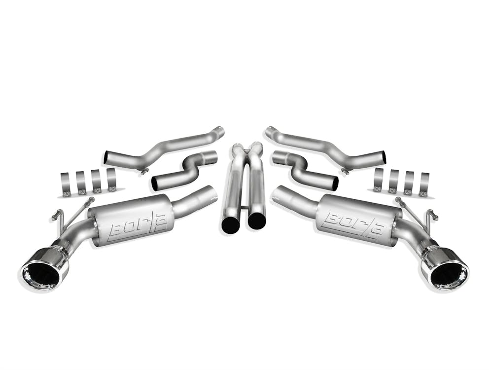 This is BORLA(r)’S complete Cat-Back(tm) system including a merge X-Pipe and ATAK(r) mufflers for improved performance and great sound on the Camaro SS WITHOUT Ground Effects Package (GFX). System features polished T-304 stainless steel tips for a sharp appearance. BORLA(r) has developed a revolutionary exhaust technology that enables our engineers to deliver unprecedented vehicle-specific control over the acoustical note of an exhaust throughout the RPM range, while retaining 100% of the power-adding capabilities of BORLA(r)’s patented multicore design. Called ATAK(r) (Acoustically-Tuned Applied Kinetics), this technology produces the highest available dB (decibel) levels in the BORLA(r) street-legal lineup, and is designed for high-performance purists who prefer exhaust notes over their stereos. The focus of ATAK(r) is to pump the volume while retaining clarity of sound, avoiding distortion typically found in louder exhausts. With ATAK(r), the sound output is tuned like a graphic equalizer to shape and focus sound waves for optimum high-volume output. The development of each ATAK(r) system begins with extensive study of each vehicle’s acoustical properties. The technology is based on custom-tuned attributes of the internal muffler cores, which are calibrated on a vehicle-by-vehicle basis to deliver the most desirable sound. A complete technology overview can be viewed at www.youtube.com/borla. Several BORLA(r) ATAK(r) systems are currently available. For the 2010-2013 6.2L V8 Camaro there is a Cat-Back(tm) system and an Axle-Back system for models without the “Ground Effects” option, and a Cat-Back(tm) system and an Axle-Back system designed to complement the Ground Effects kit. Like all BORLA(r) exhaust products, each system is handmade in the USA by master craftspeople and features premium, high-quality T-304 austenitic stainless steel construction, ultra-smooth mandrel bent piping, mirror-polished tips, and a Million-Mile Warranty.