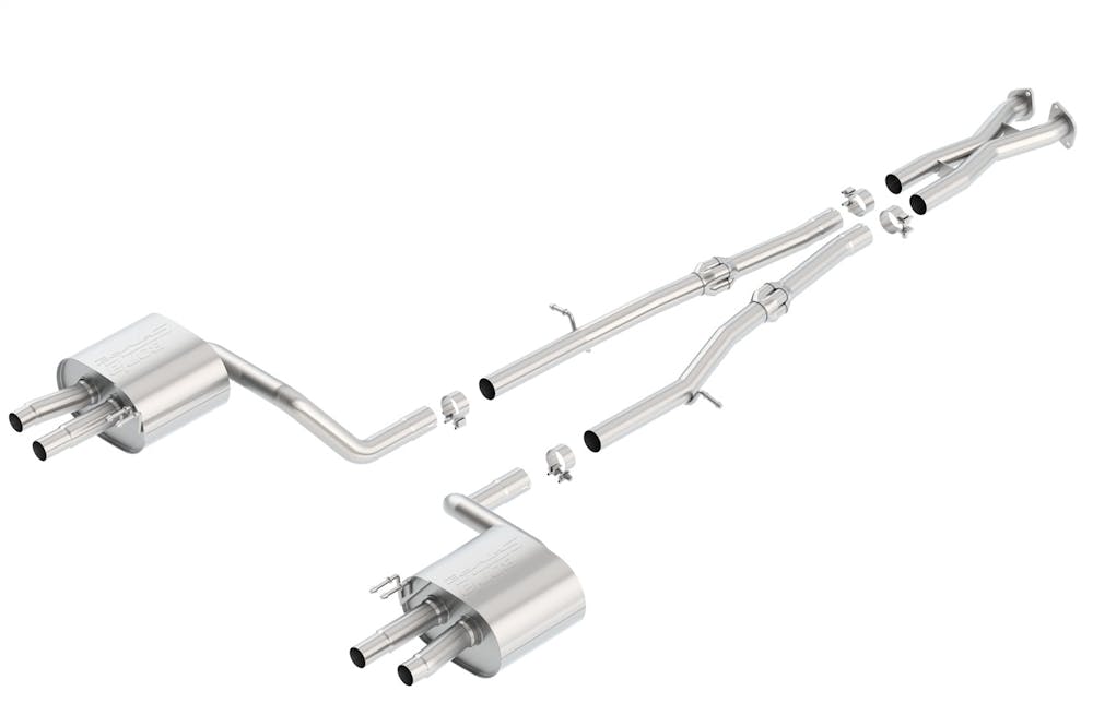This system re-uses the factory tips and does NOT include tips. Optional Borla tips can be purchased separately. Note the Related Products below. System contains X-Pipe. System also features Borla’S Polyphonic Harmonizer Technology which utilizes patented units that contain pipes of different diameters and lengths to create multiple exhaust notes that harmonize to deliver a clean, rich, full-bodied sound to the Borla mufflers. The mufflers then enhance this sound to the character and volume appropriate for our Touring, S-Type and ATAK systems. Borla Cat-Back & Axle-Back exhaust systems feature patented straight-through and multi-core technology to unleash hidden horsepower. Increased exhaust velocity adds power, driving excitement, fuel economy, and the distinctive Borla Sound of Power respected by motoring enthusiasts everywhere. Each system is built from premium T-304 austenitic stainless steel, superior to T-400 series knockoffs (such as 409), to give you the absolute best in performance and durability. Ultra-smooth mandrel bends ensure maximum flow & power, and precision computer numerical control (CNC) manufacturing ensures an accurate fit. Best of all, Borla stands behind every system with a Million-Mile Warranty. Just what you?d expect from the world?s most experienced (and most winning) exhaust brand.