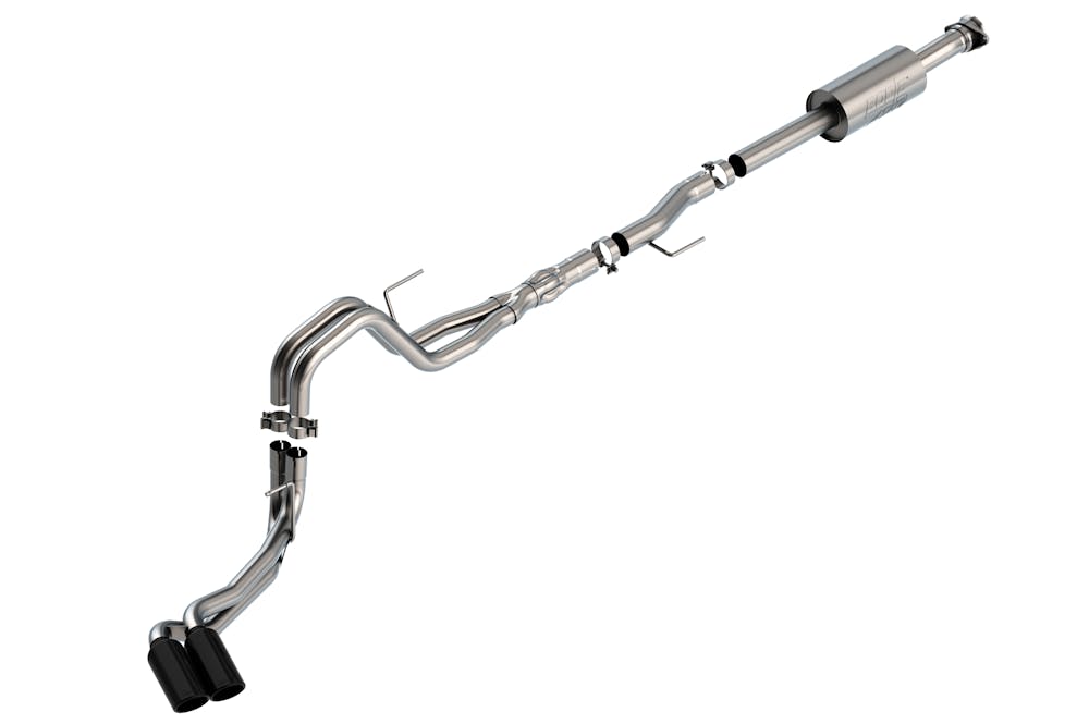 The Borla(r) Cat-Back(tm) system 140875BC was specifically designed to enhance the power and sound of the Ford F-150 equipped with the 5.0L V8 engine. It includes black chromed T-304 stainless steel tips and a dual side exit configuration. The entire system is made of T-304 stainless steel and utilizes computer numerical control (CNC) manufacturing techniques that ensure an accurate fit. This system features BORLA(r)’S Polyphonic Harmonizer Technology utilizes patented units which contain pipes of different diameters and lengths to create multiple exhaust notes that harmonize to deliver a clean, rich, full-bodied sound. This system is tuned for the ATAK(r) sound that gives you an aggressive sound with no drone. It is also available with bright chromes tips (part number 140875). There are additional systems available for the 5.0L F-150 that offer different options for sound level, tip finish and tip exits. Add adapter 60556 for Crew Cab Standard Bed (157.2) wheelbase vehicles. Add adapter 60564 for Extended Cab Long Bed (164.1) wheelbase vehicles. All this is backed by our unsurpassed Million Mile Warranty., System Features:, Cat-Back(tm) System, Dual Side Exit, Black Chrome On T-304 Stainless Steel Tips, ATAK(r) Sound Level, T-304 Stainless Steel Construction, Bolt-On Installation, Million Mile Warranty