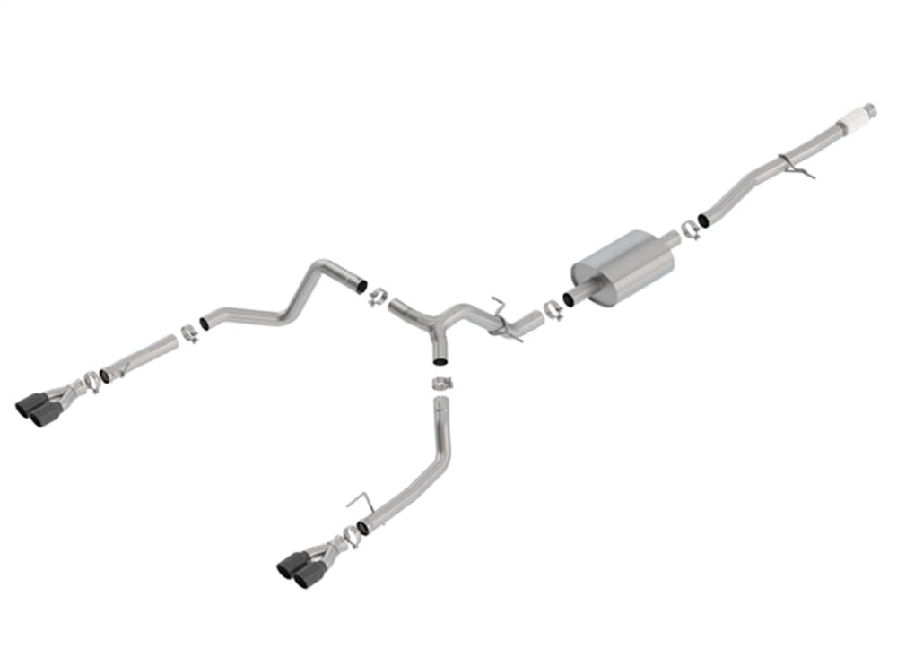 Factory Split Rear Exit vehicles ONLY. This system features a black chrome finish on T-304 stainless steel tips. Using BORLA(r) Stainless Steel Polish p# 21461 is NOT recommended with these black chrome tips. We suggest cleaning the tips with hot water and a microfiber cloth. Add Adapter 60708 for Crew Cab with Standard Bed (6′ 7″) 157″ Wheelbase vehicles. BORLA(r) Cat-Back(tm) and Axle-Back exhaust systems feature patented straight-through and multi-core technology designed to unleash hidden horsepower. Increased exhaust velocity adds power, driving excitement, fuel economy, and the distinctive BORLA(r) Sound of Power respected by motoring enthusiasts everywhere. Each system is built from premium T-304 stainless steel, superior to T-400 series knockoffs (such as 409), to give you the absolute best in performance and durability. Ultra-smooth mandrel bends ensure maximum flow& power, and precision computer numerical control (CNC) manufacturing ensures an accurate fit. Best of all, BORLA(r) stands behind every system with a Million-Mile Warranty. Just what you’d expect from the world’s most experienced (and most winning) exhaust brand.