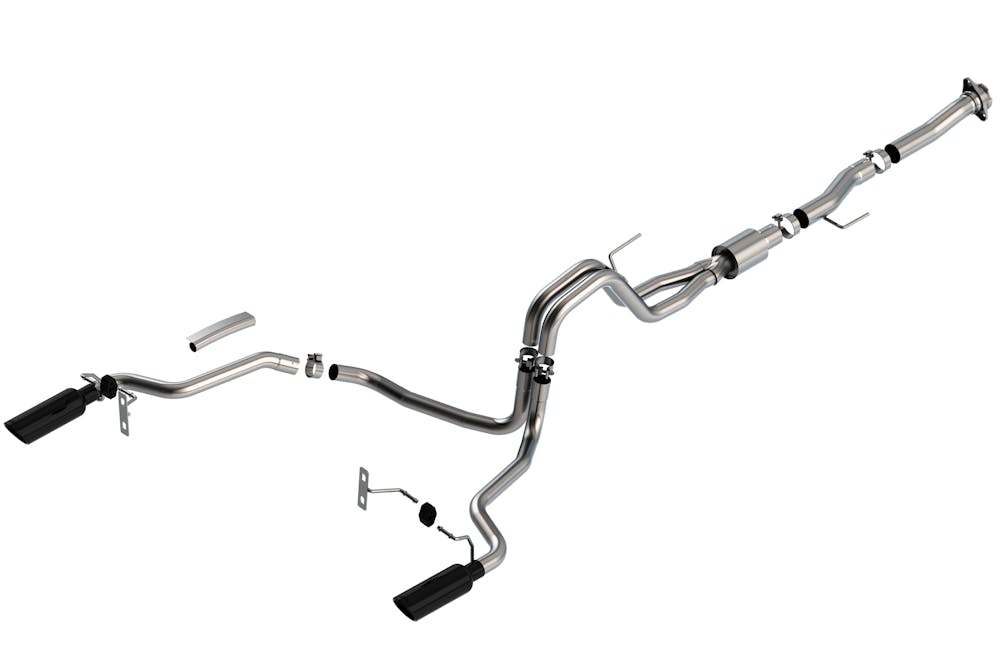 The Borla(r) Cat-Back(tm) system 140869BC was specifically designed to enhance the power and sound of the Ford F-150 equipped with the 5.0L V8 engine. It includes black chromed T-304 stainless steel tips and a split rear exit configuration. The entire system is made of T-304 stainless steel and utilizes computer numerical control (CNC) manufacturing techniques that ensure an accurate fit. This system features the ATAK(r) sound that gives you our most aggressive sound level with no drone. It is also available with bright chromed tips (part number 140869). There are additional systems available for the 5.0L F-150 that offer different options for sound level, tip finish and tip Exits. Add adapter 60564 for Regular Cab Long Bed (141.5) wheelbase vehicles. All this is backed by our unsurpassed Million Mile Warranty., System Features:, Cat-Back(tm) System, Split Rear Exit, Black Chrome On T-304 Stainless Steel Tips, ATAK(r) Sound Level, T-304 Stainless Steel Construction, Bolt-On Installation, Million Mile Warranty
