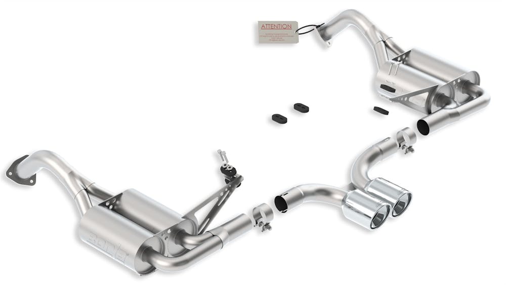 The BORLA(R) sound of power. Its been described as asonic shot of adrenaline. An intoxicating concert ofsteel, gears and combustion that echoes from thespeedways, deserts and highways of the world.The sound of more victory laps than any otherbrand, the BORLA(R) exhaust note has become the quintessentioal soundtrack of high-performance motoring. And like all good automotive designs there is function behing the form. As any driving enthusiast knows, the sound of an exhaust provides more than just ear candy. Its a communications conduit between car and driver. A link between human and machine. The exhaust sound provides accoustic feedback of engine rpm to aid the driver in critical decisions such as gear selection or throttle input in rev-match shifting. At BORLA(R), we understand this concept better than any exhaust manufacturer. Combining patented technology with computer modeling, extensive prototyping and advanced sound analysis tools. BORLA(R) engineers spend countless hours tuning exhaust systems to best reflect the personality and performance of vehicle applications. The result is an enhanced driving experience. With unrivaled clarity, the BORLA(R) exhaust note can help a driver stay within the powerband through a difficult section, using the exciting sensory feedback of sound. With unrivaled clarity the Borla exhaust note can help a driver stay within the powerband through a difficult section, using the exciting sensry feedback of sound.