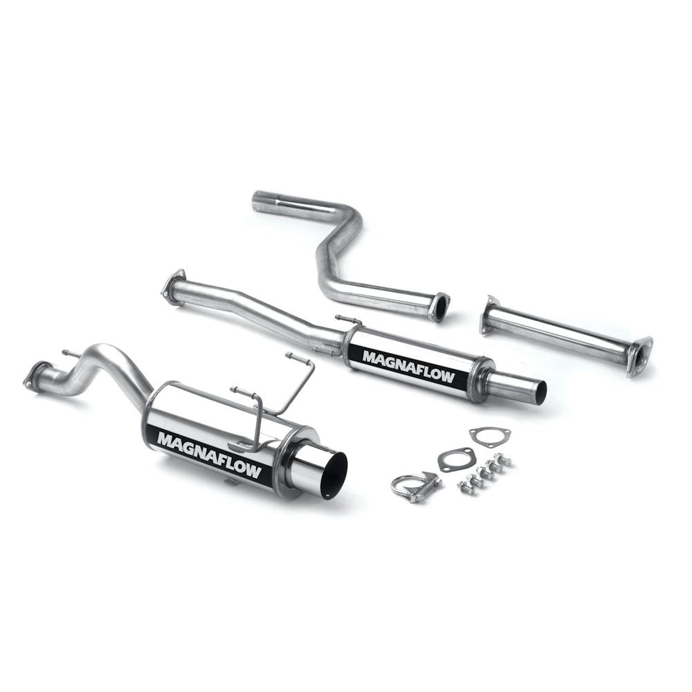 The MagnaFlow 1992-2000 Honda Civic Street Series Cat-Back Performance Exhaust System brings out the personality of your 1.5L, 1.6L 1992-2000 Honda Civic with our signature resonant, powerful engine tone and dyno-proven performance. Thanks to its fast-flowing, mandrel bent 2.25in. main piping and 2 Straight-Through mufflers ending in a Single Straight Passenger Side Rear exit with 4in. Polished Welded-On Single Wall Straight Cut Cut Edge tips, this Honda Civic exhaust kit has the performance chops to match its sporty sound and appearance. Upgrade your ride to the next level with an exhaust that has the pipes to put other Honda Civic’s to shame. With this system your vehicle will be producing Moderate exterior and Mild interior sound levels while leaving other cars and trucks feeling envious at every stoplight. Exhaust kit 15643 features a cat-back layout that replaces your ride’s stock exhaust components from near the catalytic converter on back. Extensive 3D scanning during development has resulted in a direct-fit design that you can easily install yourself. 15643 is produced using CNC precision robotic manufacturing techniques and is backed by MagnaFlow’s 1-year limited finish warranty and limited lifetime construction warranty.