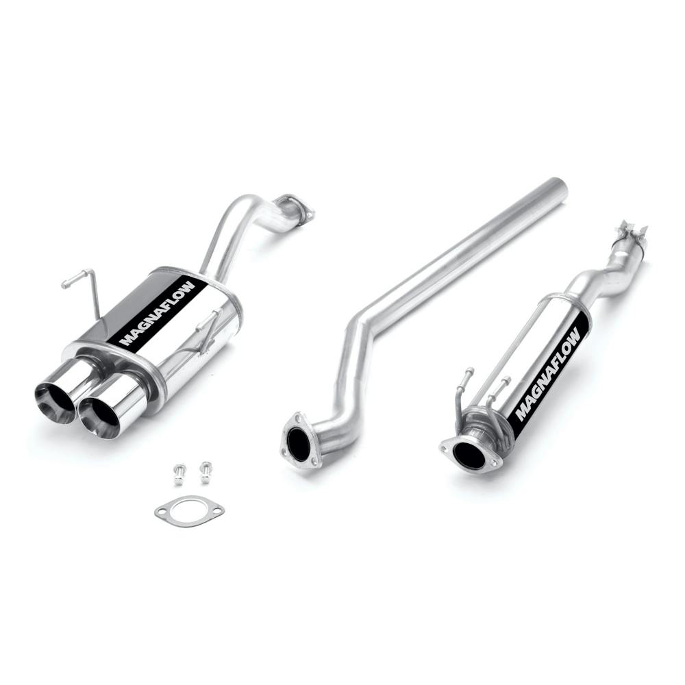 The MagnaFlow 2002-2005 Honda Civic Street Series Cat-Back Performance Exhaust System brings out the personality of your 2.0L 2002-2005 Honda Civic with our signature resonant, powerful engine tone and dyno-proven performance. Thanks to its fast-flowing, mandrel bent 2.25in. main piping and 2 Straight-Through mufflers ending in a Dual Straight Passenger Side Rear exit with 3.5in. Polished Welded-On Double Wall Straight Cut Folded Edge tips, this Honda Civic exhaust kit has the performance chops to match its sporty sound and appearance. Upgrade your ride to the next level with an exhaust that has the pipes to put other Honda Civic’s to shame. With this system your vehicle will be producing Moderate exterior and Mild interior sound levels while leaving other cars and trucks feeling envious at every stoplight. Exhaust kit 15757 features a cat-back layout that replaces your ride’s stock exhaust components from near the catalytic converter on back. Extensive 3D scanning during development has resulted in a direct-fit design that you can easily install yourself. 15757 is produced using CNC precision robotic manufacturing techniques and is backed by MagnaFlow’s 1-year limited finish warranty and limited lifetime construction warranty.